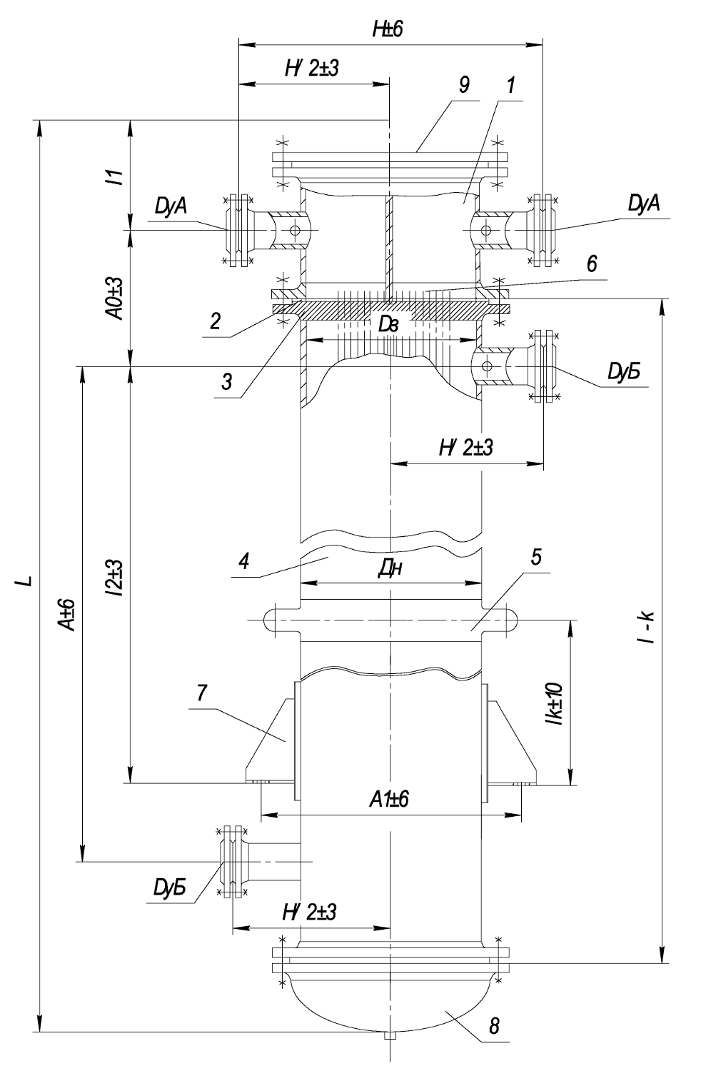 | Длина теплообменных труб, мм для аппаратов диаметром, мм | 600 (630), 800, 1000 | 3000; 4000; 6000 | |
